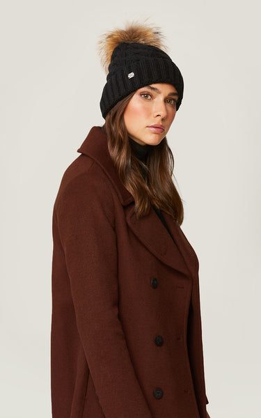AMALIE by SOIA & KYO is a cable knit hat with a removable natural fur pom pom. Its classic folded rib knit hem frames the face and keeps your ears toasty warm during cold winter months.