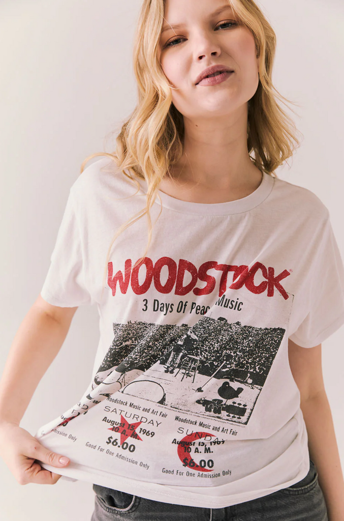 The Woodstock Peace And Music Ticket Tee showcases the iconic ticket design from the legendary festival, perfect for music lovers seeking a touch of nostalgia.