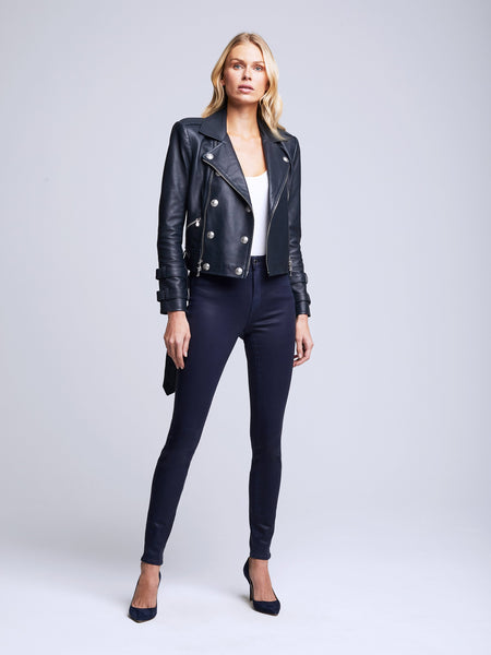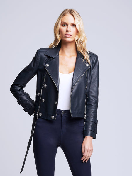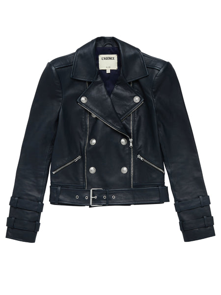 A biker-style blue leather jacket elevated by embossed silvertone buttons. Edgy-authentic details include zipper pockets and zipper trim, sleeve straps, and chunky belt with buckle. Fully lined. 100% Lambskin.