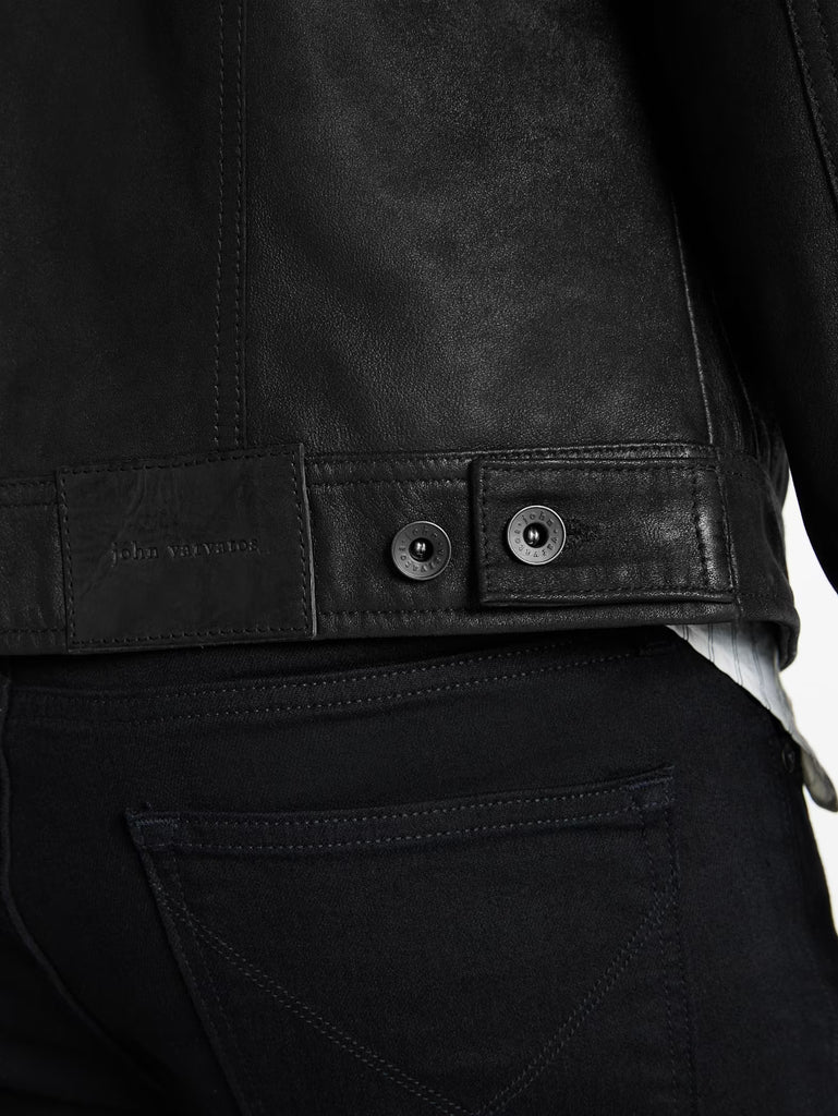The Andrew Trucker redefines the classic trucker jacket with a modern take. Expertly crafted from weathered sheepskin featuring an irregular texture, and detailed with a crackle-textured goatskin collar, this piece merges rugged aesthetics with refined artistry. The interior boasts a peace print lining, while traditional shank closures enhance its classic appeal. It's a fresh update on a timeless style.