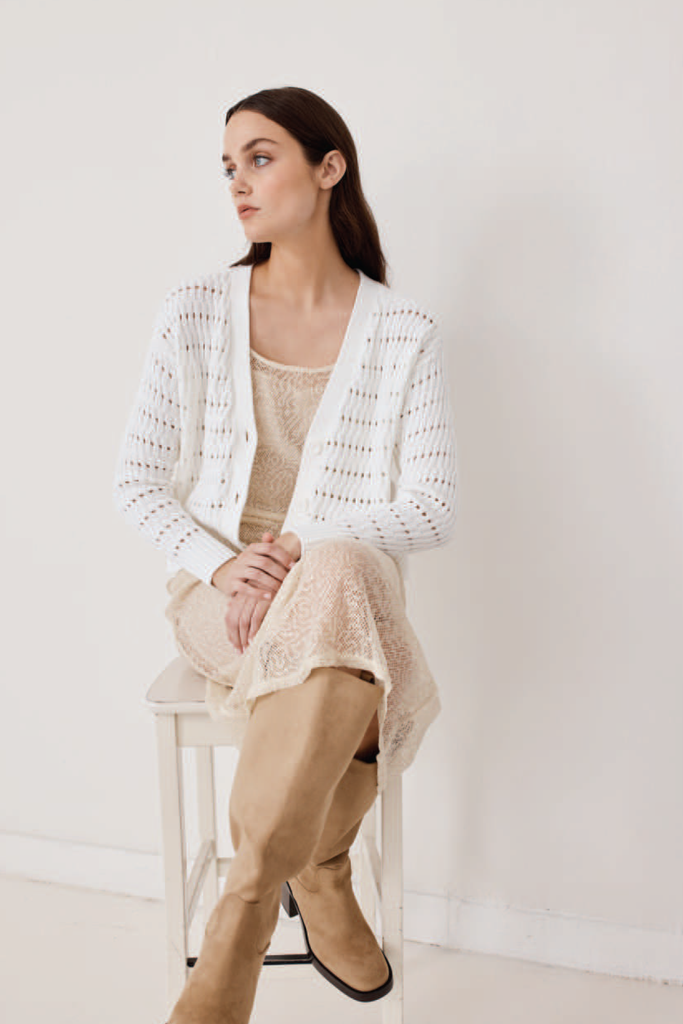 This cropped Autumn Cashmere cardigan redefines everyday luxury with its textured broken rib stitch and modern proportions. The boxy silhouette adds contemporary appeal while maintaining a soft, wearable feel. Designed in a clean bleach white, it’s a versatile piece that elevates any wardrobe. Style with high-rise denim or a slip skirt to balance the cropped length, or layer over a fitted tank for an effortlessly cool look.