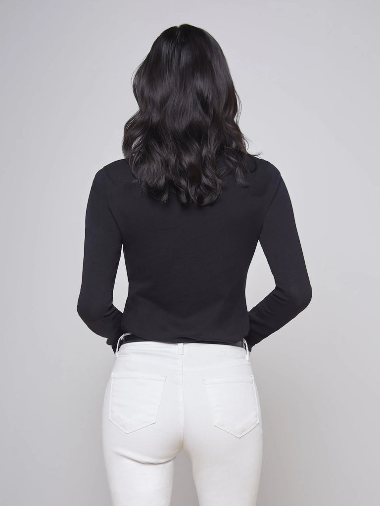 A form-fitting, long-sleeved crew neck tee in rich black. Crafted from soft and stretchy luxe microfiber, Tess features a high crew neck, long sleeves, and a smooth, lean fit.