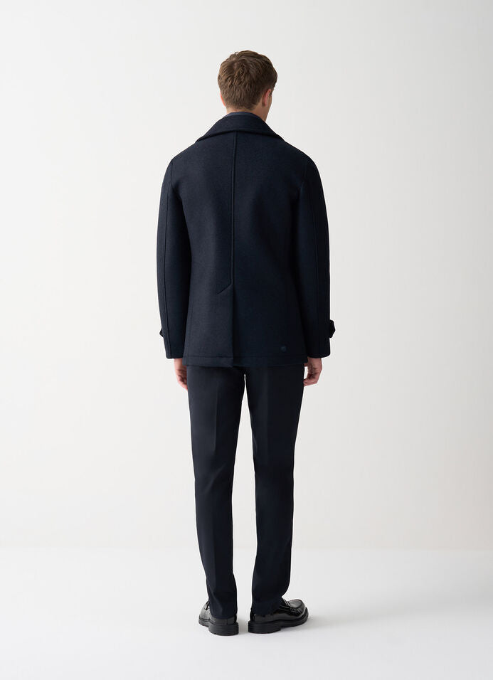 The quintessential peacoat, made from heavy wool cloth, stands out with its traditional double-breasted design, large visible buttons and clean lines. The structured fit and side pockets make it an iconic and timeless piece, perfect for winter. Can be paired with gilet Mod. 1126 8VX, thanks to the special tape, to add an extra layer on the coldest days. A versatile and warm look, ideal for going from casual to formal.