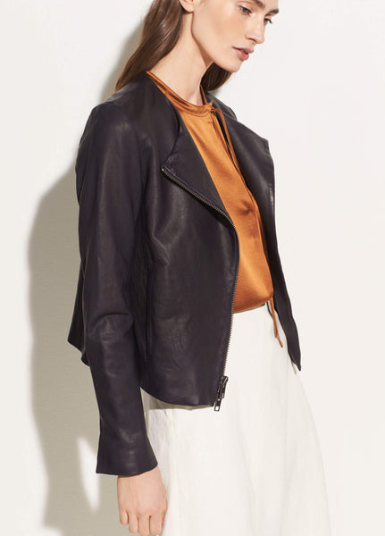 Crafted from buttery washed-leather, the cross front jacket is a brand signature. It has a simple shape and streamlining on seam pockets.